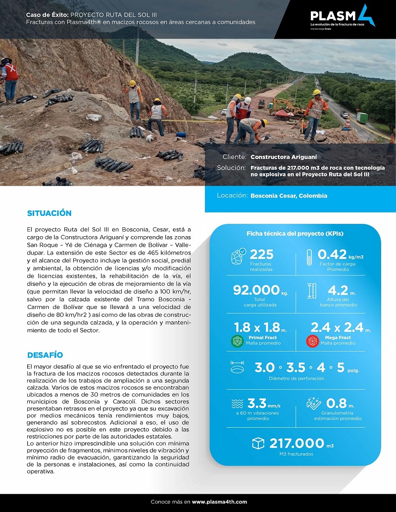 Gracias al uso de Plasma 4 TH los trabajos de avance del Proyecto Ruta del Sol 111 se mejoraron exponencialmente logrando la continuidad de los procesos y mejorando el rendimiento de la excavación de roca, cumpliendo así con los tiempos planificados inicialmente en el cronograma de obra.